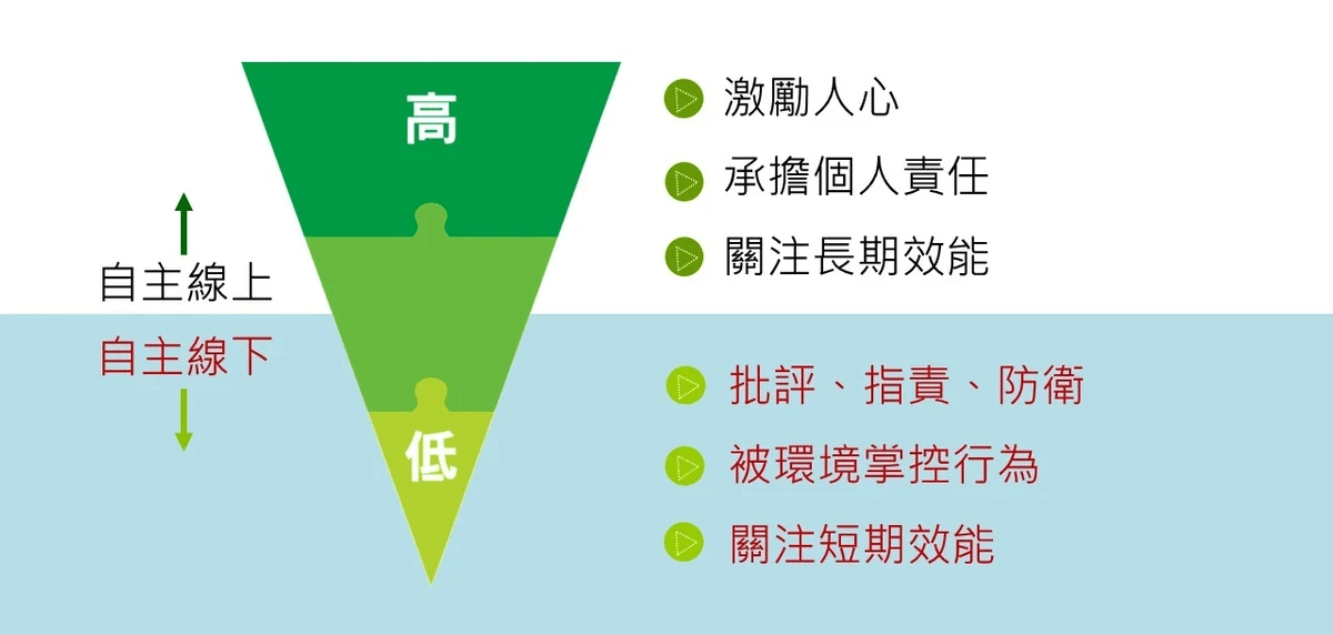 每個人都有好的狀態與不好的狀態,可能會展現健康可愛的樣貌,也可能因著外在環境,做出令他人感到不舒服的行為。若處在安全無壓力的狀態,較容易展現出自主線上的反應,例如自我反思、傾聽、包容、關注團隊需要;若處在高壓力環境下,或遇到挑戰傷害時,較會進入自主線下層級,可能會展現指責他人、自我防衛、關注個人利益、討厭自己也討厭身邊的人、不能獨處也不好相處。