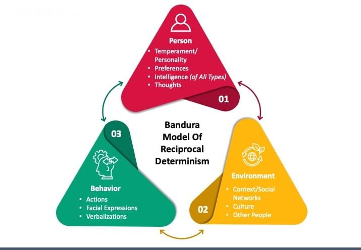 亞伯特·班度拉(Albert Bandura)提出的相互決定論(Reciprocal determinism),環境會塑造一個人的「認知結構」,像信念及期望。而人的認知結構又會決定一個人的行為,而人的行為又會改變環境。因此這三個元素(認知結構、外顯行為、環境)會互相影響。